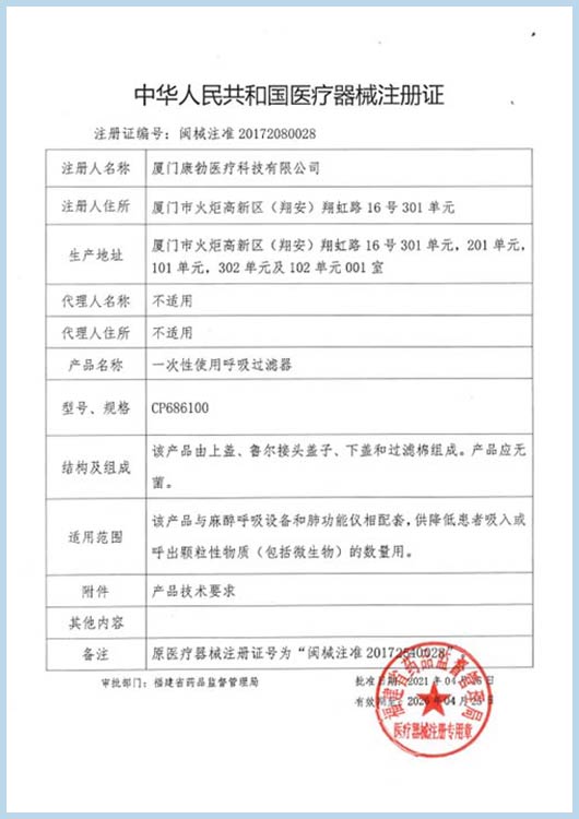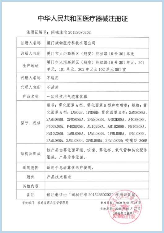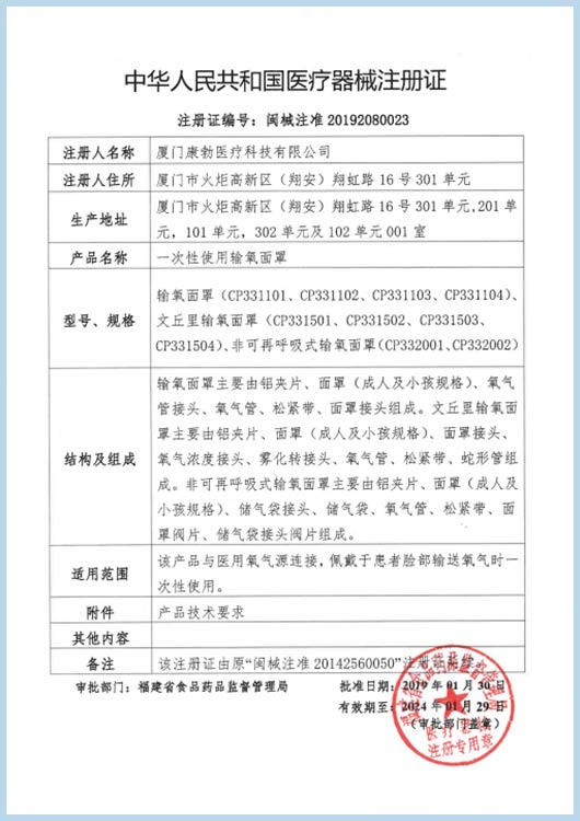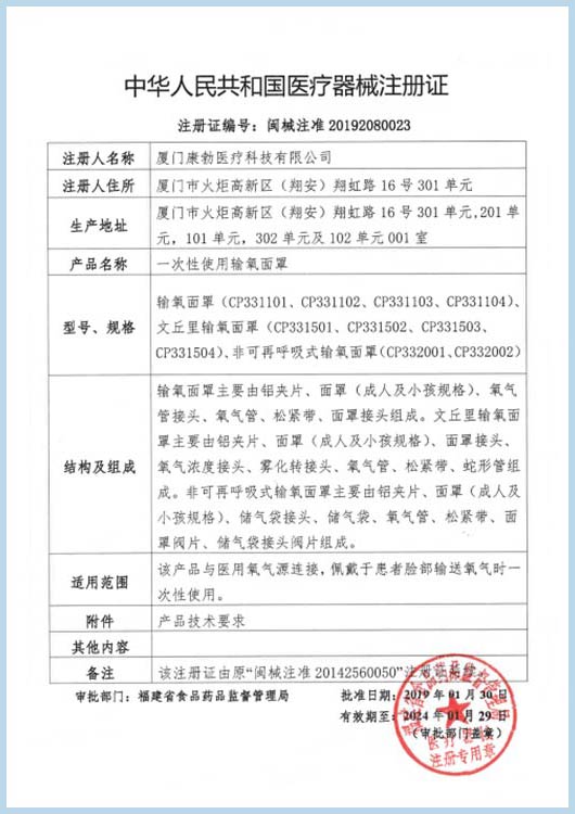 Disposable Simple Oxygen mask Registration certificate by CFDA
