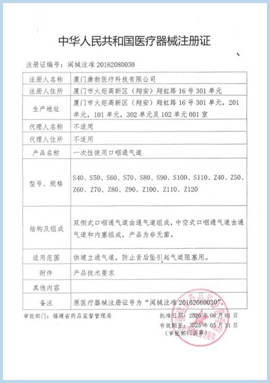 Disposable oropharyngeal airway Registration certificate by CFDA